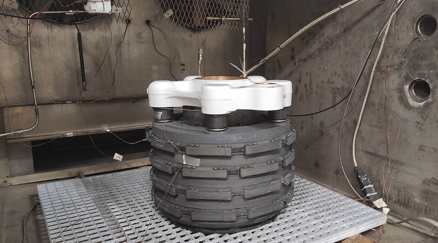 Sopemea carries out many types of tests, including icing tests. An icing test consists of creating a film of ice on the equipment and then melting it, several times in a row. Once all the cycles have been completed, the technician simulates different types of braking to check that the brake still works. Then the technician dismantles the equipment and checks whether or not water has infiltrated. In the case of our icing test for Safran Landing Systems, the equipment was a carbon brake developed for a long-haul commercial aircraft. Our technician therefore had to simulate the climatic conditions experienced by an aircraft brake throughout a flight. The aim of this test was to check the ability of the material to maintain its functionality despite the potential presence of water in it, following the various films of ice applied.